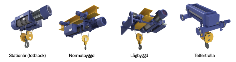 •Lågbyggd: Telfern försedd med åkverk. För enbalkstravers eller monorail där lyfthöjden är kritisk.