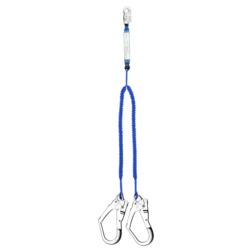 Dubbel fälldämparlina utrustad med stötdämpare och tre säkerhetskopplingar för ökad trygghet vid arbete på höjd. Linan är tillverkad i slitstark polyamid och är konstruerad för att minska kraften vid ett eventuellt fall.