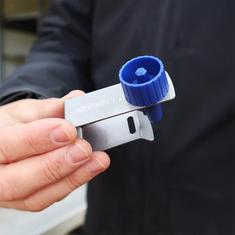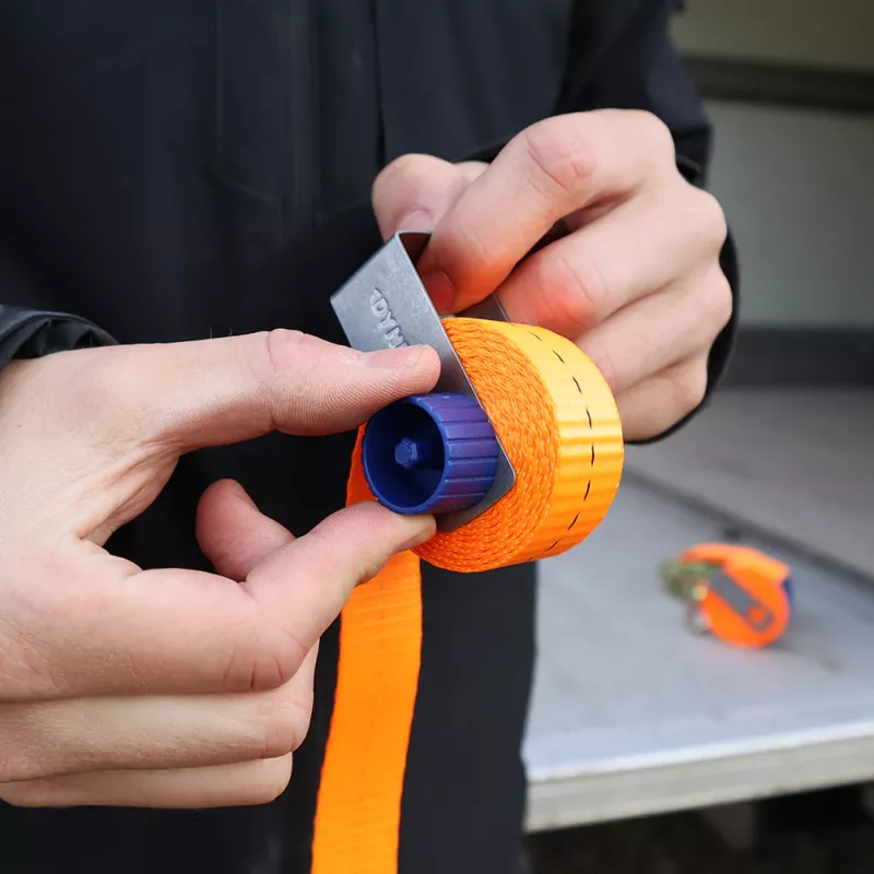 Dynello band-clip med integrerad upprullare avsedd för effektiv upprullning och förvaring av 25 mm breda spännband.