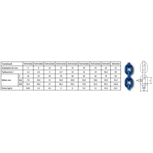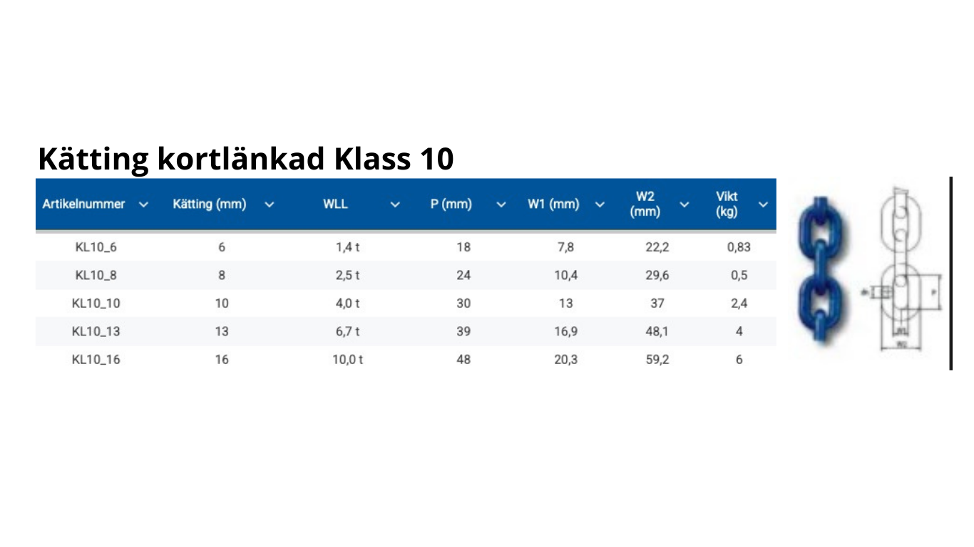 Köp kortlänkad kätting klass 10. | Dessa länkar är avsedda för lyft och finns att välja i storlekarna 6, 8, 10, 13 och 16 mm. | Se WLL nedan.