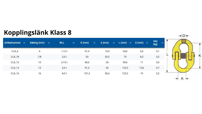 Köp kopplingslänk klass 8 i kätting. | Välj mellan WLL 1,12 ton - 2,0 ton - 3,15 ton -5,3 ton och 8,0 ton. | Lyftutrustning/Kättingkomponenter.